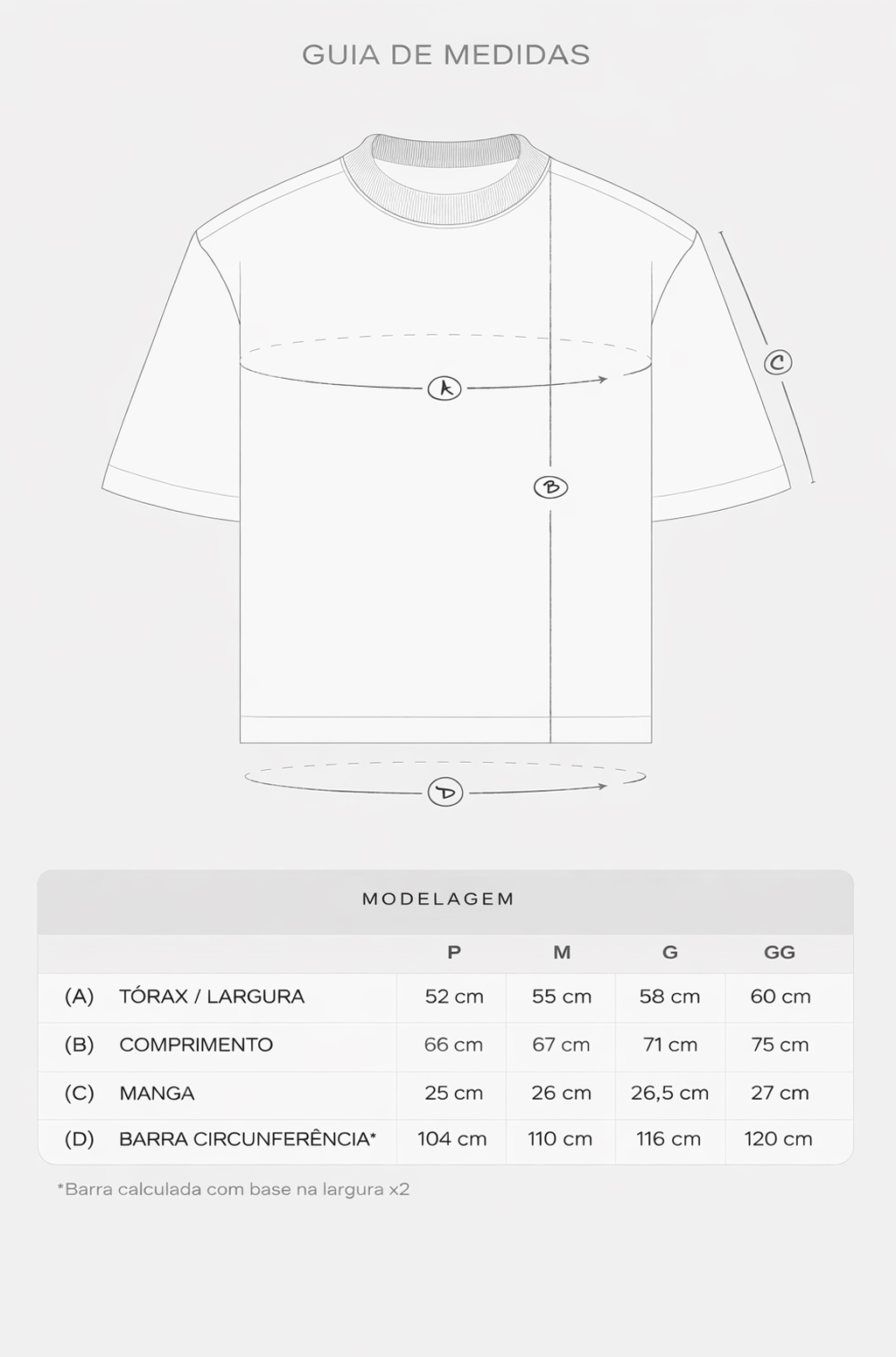 Malha 100% algodão de alta qualidade, com gramatura 170g, garantindo um equilíbrio perfeito entre leveza e resistência. Toque macio, respirável e extremamente confortável para o uso diário.